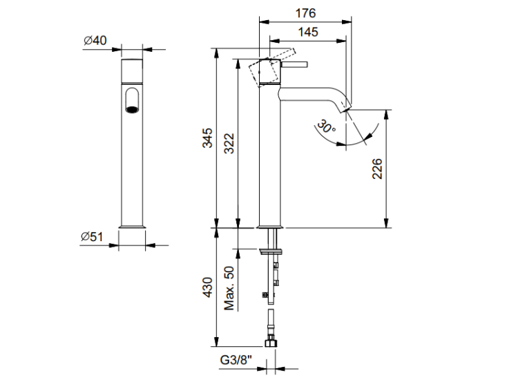 Смеситель для раковины, Fantini, Nostromo, тип открывания воды-однорычажный, отверстия для монтажа-1, высота, мм-345, вынос излива, мм-176, тип подводки-гибкая, цвет-хром Смеситель для раковины, Fantini, Nostromo, цвет-хром