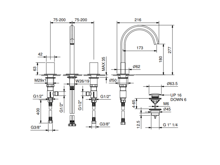 Смеситель для раковины, Fantini, Venezia, тип открывания воды-двухвентильный, тип регулирования воды-керамический картридж, тип установки-на раковину, отверстия для монтажа-3, высота, мм-277, вынос излива, мм-173, донный клапан-есть, цвет-хром Смеситель для раковины, Fantini, Venezia, цвет-хром