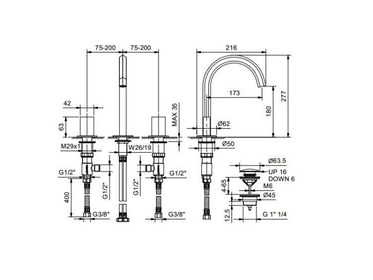Смеситель для раковины, Fantini, Venezia, тип открывания воды-двухвентильный, тип регулирования воды-керамический картридж, отверстия для монтажа-3, высота, мм-277, вынос излива, мм-175, донный клапан-есть, нажимного типа, тип подводки-гибкая, стандарт подвода воды-3/8", цвет-золото плюс, ручки заказываются отдельно Смеситель для раковины, Fantini, Venezia, цвет-золото плюс