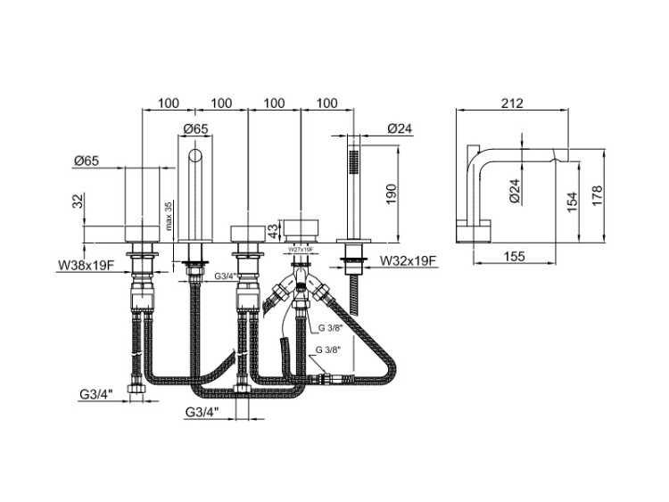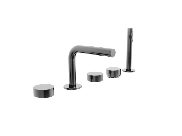 Смеситель для ванны и душа, Fantini, AF/21 Fukasawa, тип открывания воды-двухвентильный, тип регулирования воды-керамический картридж, тип установки-на борт ванны, отверстия для монтажа-5, вынос излива, мм-155, цвет-хром, в комплекте-ручки, переключатель на 2 потока с кнопкой, ручная лейка FIT, гибкий шланг,мм-1500, впуски 3/4'', подводка Смеситель для ванны и душа, Fantini, AF/21 Fukasawa, цвет-хром