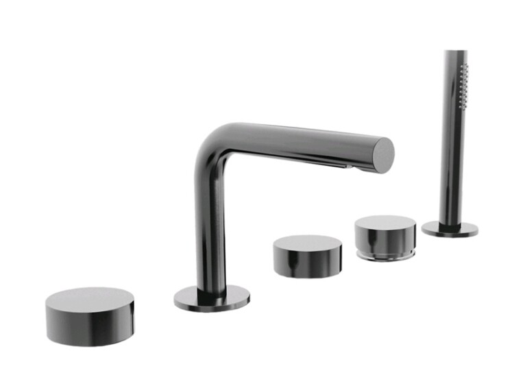 Смеситель для ванны и душа, Fantini, AF/21 Fukasawa, тип регулирования воды-керамический картридж, тип установки-на борт ванны, отверстия для монтажа-5, вынос излива, мм-155, в комплекте-ручки, переключатель на 2 потока с кнопкой, ручная лейка FIT, гибкий шланг,мм-1500, впуски 3/4'', подводка, цвет-Matt British Gold PVD Смеситель для ванны и душа, Fantini, AF/21 Fukasawa, цвет-Matt British Gold PVD