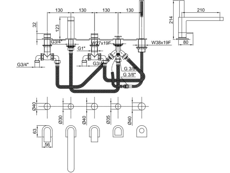 Смеситель для ванны и душа, Fantini, Mare, тип открывания воды-двухрычажный, тип регулирования воды-керамический картридж, тип установки-на борт ванны, отверстия для монтажа-5, вынос излива, мм-210, цвет-хром, в комплекте-ручки, переключатель на 2 потока с кнопкой, ручная лейка SUN, гибкий шланг,мм-1500, впуски 3/4'', подвод Смеситель для ванны и душа, Fantini, Mare, цвет-хром