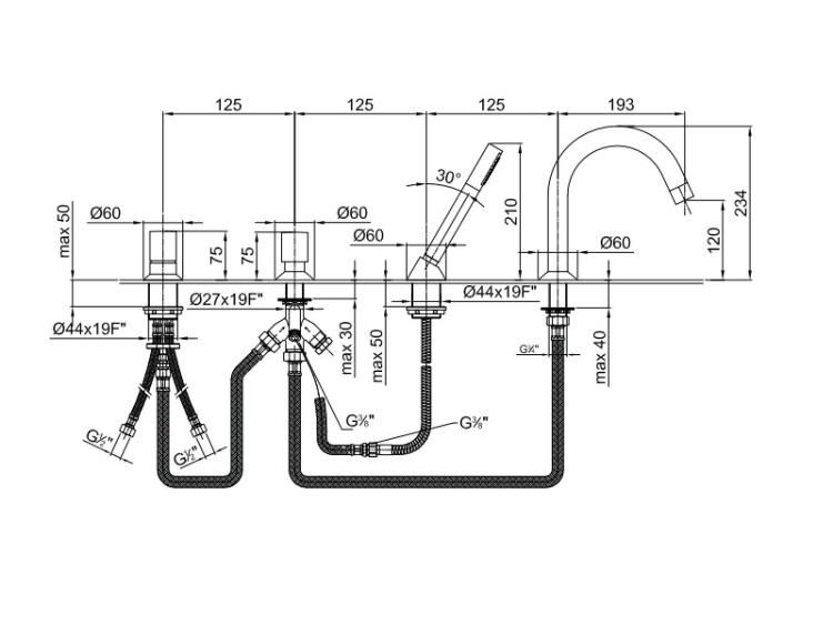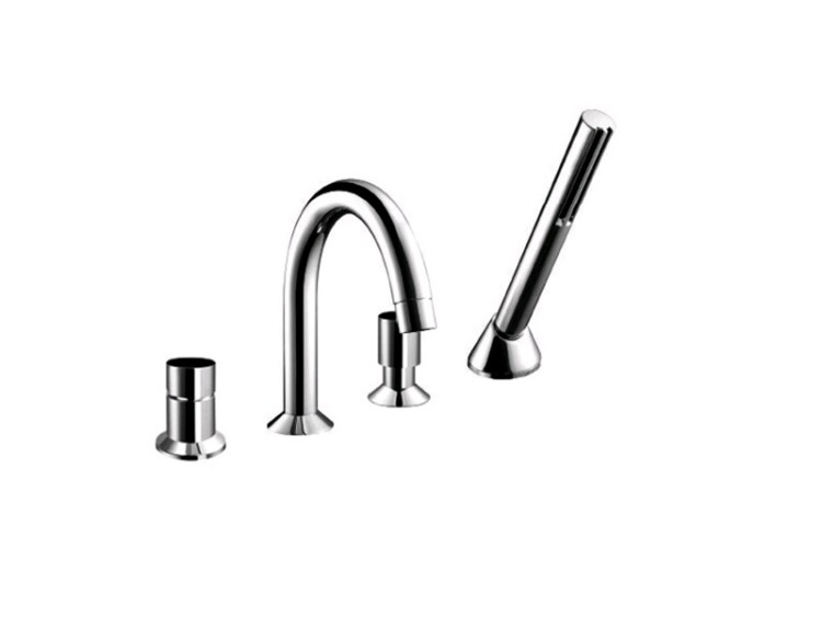 Смеситель для ванны и душа, Fantini, Nostromo, тип открывания воды-одновентильный, тип установки-на борт ванны, отверстия для монтажа-4, вынос излива, мм-195, цвет-хром, в комплекте-ручки, переключатель на 2 потока с кнопкой, ручная лейка SUN, гибкий шланг,мм-1500, впуски 1/2'', подводка Смеситель для ванны и душа, Fantini, Nostromo, цвет-хром