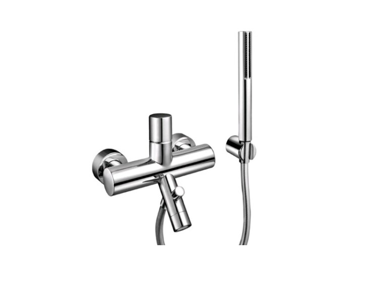 Смеситель для ванны и душа, Fantini, Nostromo, тип установки-настенный, отверстия для монтажа-3, вынос излива, мм-140, в комплекте-ручка, автоматический переключатель на 2 потока, ручная лейка, форма-цилиндрическая, держатель ручной лейки, гибкий шланг,мм-1500, ПВХ, цвет-хром Смеситель для ванны и душа, Fantini, Nostromo, цвет-хром