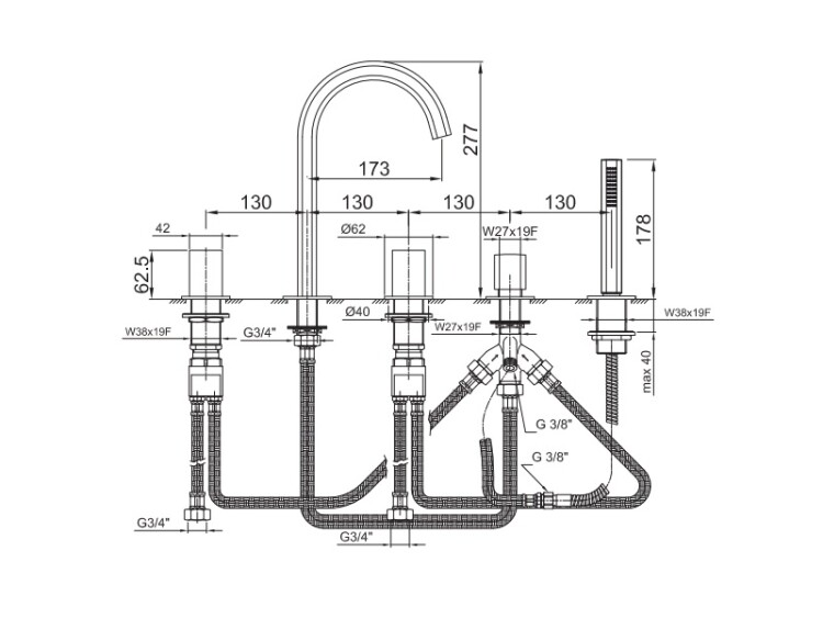 Смеситель для ванны и душа, Fantini, Venezia, тип открывания воды-двухвентильный, тип регулирования воды-керамический картридж, тип установки-на борт ванны, отверстия для монтажа-5, вынос излива, мм-175, цвет-хром, ручки заказываются отдельно, в комплекте-переключатель на 2 потока с кнопкой, ручная лейка VENEZIA, гибкий шланг,мм-1500, впуски 3/4'', подводка Смеситель для ванны и душа, Fantini, Venezia, цвет-хром