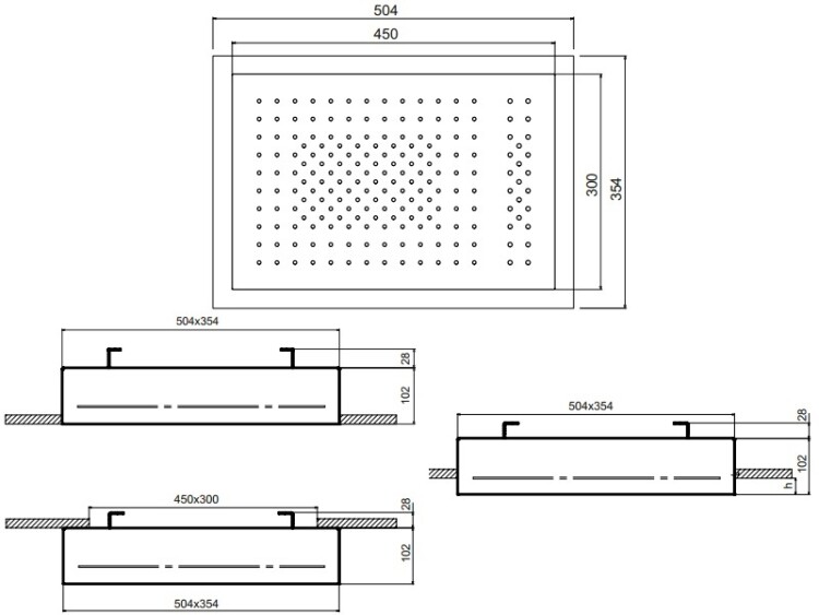 Верхний душ, Fantini, ACQUAFIT, тип установки-потолочный: утопленная, полу-утопленная, внешняя, ширина, мм-500, глубина, мм-354, высота, мм-102, форма-прямоугольная, количество режимов-2, тип струи-двойной дождь с 170 противоизвестковыми форсунками, тонизирующий поток с 25 противоизвестковыми форсунками, внутренняя часть-есть, цвет-блестящая натуральная сталь Верхний душ, Fantini, ACQUAFIT, шгв 504*354*102, цвет-блестящая натуральная сталь