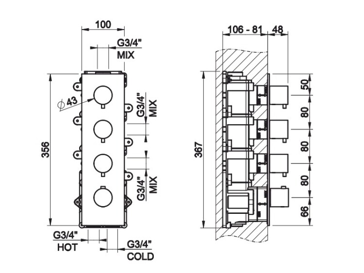 Смеситель для душа, Gessi, 316 WELLNESS, тип открывания воды-вентильный, тип регулирования воды-термостатический картридж, тип установки-встраиваемый, внутренняя часть-необходимо заказать, цвет-Black Metal Brushed PVD, подключение на 3/4", с вертикальной/горизонтальной установкой, 3 независимых выхода Смеситель для душа, Gessi, 316 WELLNESS, цвет-Black Metal Brushed PVD