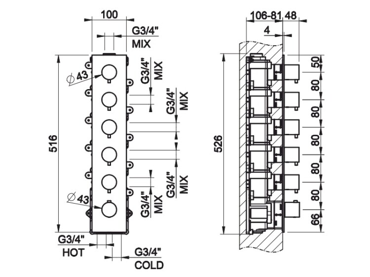 Смеситель для душа, Gessi, Shower316, тип открывания воды-вентильный, тип регулирования воды-термостатический картридж, тип установки-встраиваемый, отверстия для монтажа-6, внутренняя часть-необходимо заказать, цвет-Black Metal Brushed PVD, на 3/4", с вертикальной/горизонтальной установкой, с пятью независимыми выходами Смеситель для душа, Gessi, Shower316, цвет-Black Metal Brushed PVD
