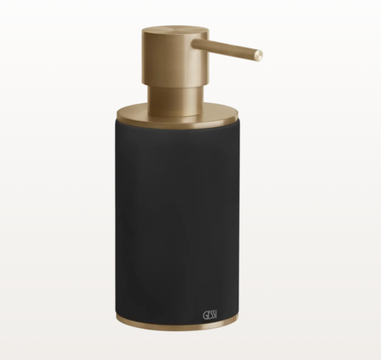 Дозатор для жидкого мыла, Gessi, 316, механический (нажимной), ширина, мм-75, глубина, мм-117, высота, мм-191, тип установки-настольный (свободностоящий), материал колбы-керамика, цвет колбы-черный, цвет дозатора-Warm Bronze Brushed PVD Дозатор для жидкого мыла, Gessi, 316, шгв 75*117*191, цвет дозатора-Warm Bronze Brushed PVD