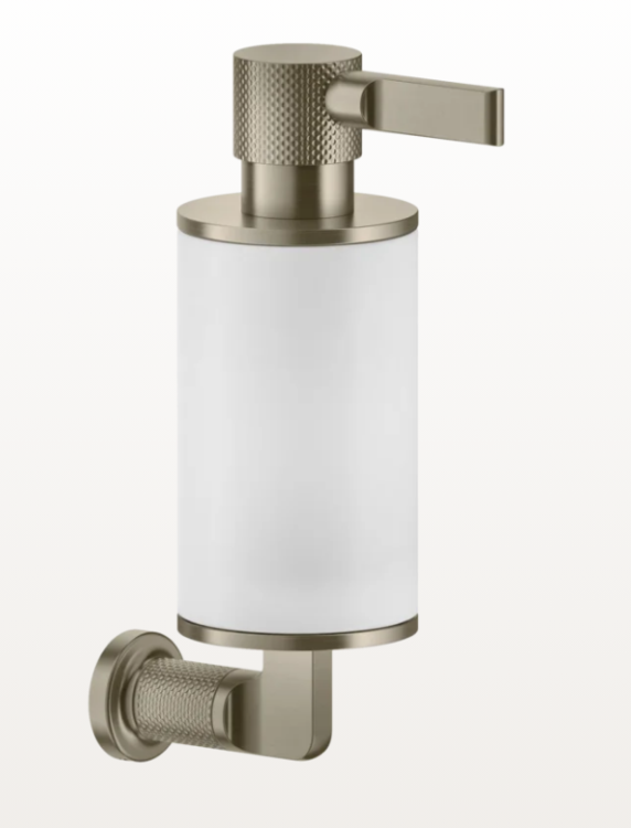 Дозатор для жидкого мыла, Gessi, Inciso, механический (нажимной), ширина, мм-75, глубина, мм-147, высота, мм-240, тип установки-настенный, материал колбы-стекло, цвет колбы-белый матовый, цвет дозатора-Finox Brushed Nickel Дозатор для жидкого мыла, Gessi, Inciso, шгв 75*147*240, цвет дозатора-Finox Brushed Nickel