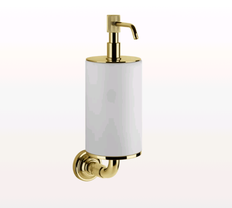 Дозатор для жидкого мыла, Gessi, VENTI20, механический (нажимной), ширина, мм-75, глубина, мм-136, высота, мм-254, тип установки-настенный, цвет колбы-белый, цвет дозатора-золото PVD (Gold PVD, Gold Polished PVD) Дозатор для жидкого мыла, Gessi, VENTI20, шгв 75*136*254, цвет дозатора-золото PVD (Gold PVD, Gold Polished PVD)