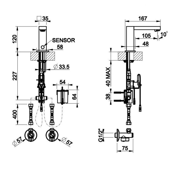Смеситель для раковины, Gessi, Sensor Taps, тип открывания воды-бесконтактный/электронный, с кран-фильтром для регулировки температуры и напора воды, монтаж-на раковину/столешницу, отверстия для монтажа-1, высота, мм-120, вынос излива, мм-105, тип излива-неподвижный, донный клапан-отсутствует, тип подводки-гибкая, стандарт подвода воды-3/8", цвет-хром Смеситель для раковины, Gessi, Sensor Taps, цвет-хром