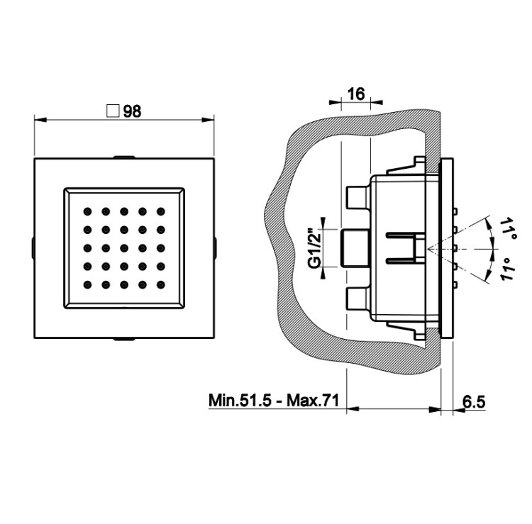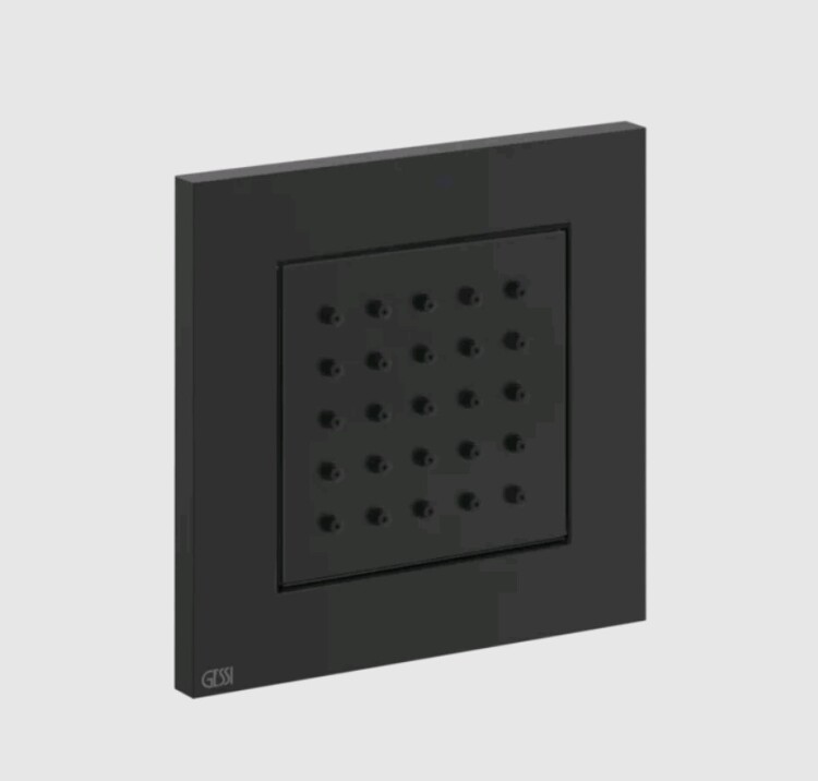 Форсунка, Gessi, Body Jets, боковая, форма-прямоугольная, ширина, мм-98, глубина, мм-10, высота, мм-98, тип установки-встраиваемая, регулируемая, угол поворота-11, внутреннюю часть-необходимо заказать, цвет-чёрный матовый Форсунка, Gessi, Body Jets, цвет-чёрный матовый