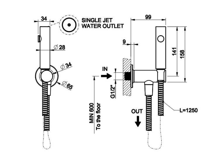 Гигиенический душ, Gessi, Inciso, шланг-есть, длина шланга, мм-1250, держатель-есть, цвет-Black XL, настенный на 1/2" Гигиенический душ, Gessi, Inciso, цвет -Black XL