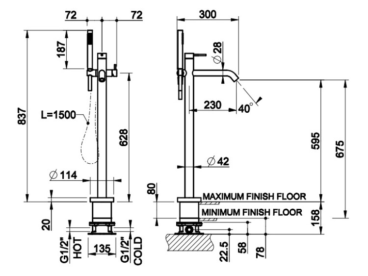 Смеситель для ванны и душа, Gessi, BATH316, тип открывания воды-однорычажный, тип установки-напольный, отверстия для монтажа-1, вынос излива, мм-230, внутренняя часть-необходимо заказать, цвет-Steel Brushed, комплектация-ручной душ, шланг, держатель ручного душа Смеситель для ванны и душа, Gessi, BATH316, цвет-Steel Brushed