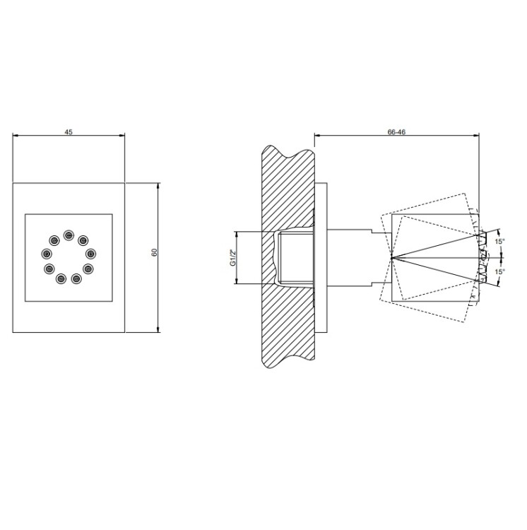 Форсунка, Gessi, Body Jets, одноструйная, форма-квадратная, ширина. мм-45, глубина. мм-66, высота, мм-60, поворотная, угол поворота-15, цвет-хром Форсунка, Gessi, Body Jets, цвет-хром