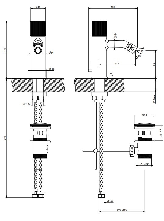 Смеситель для биде, Gessi, Habito, RIGATO, тип открывания воды-однорычажный, тип регулирования воды-керамический картридж, отверстия для монтажа-1, высота, мм-177, вынос излива, мм-111, донный клапан-есть, тип подводки-гибкая, стандарт подвода воды-3/8", цвет-Brushed Brass PVD Смеситель для биде, Gessi, Habito, RIGATO, цвет-Brushed Brass PVD