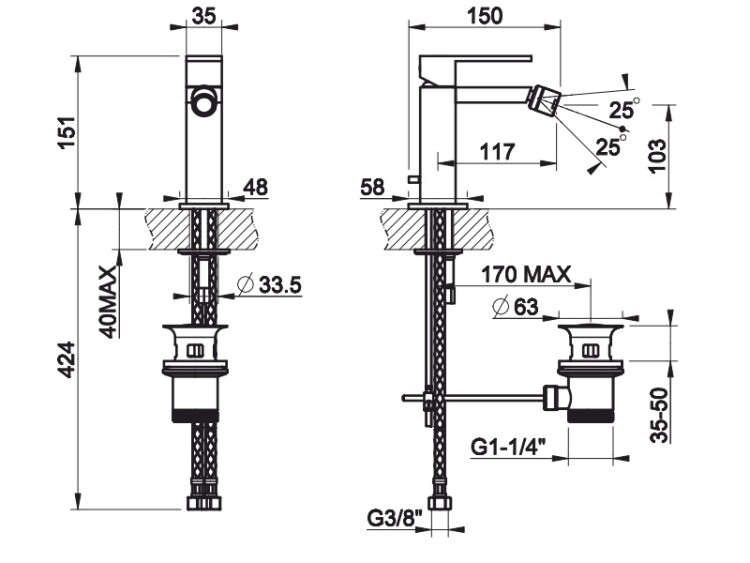 Смеситель для биде, Gessi, Rettangolo, тип открывания воды-однорычажный, отверстия для монтажа-1, высота, мм-151, вынос излива, мм-117, донный клапан-есть, тип подводки-гибкая, стандарт подвода воды-3/8", цвет-Black XL Смеситель для биде, Gessi, Rettangolo, цвет-Black XL