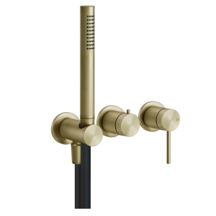 Смеситель для душа, Gessi, 316 Bath-Shower, на 2 потребителя, тип открывания воды-однорычажный, тип регулирования воды-керамический картридж, монтаж-настенный встраиваемый, отверстия для монтажа-3, комплектация-ручной душ, держатель ручного душа с шланговым подсоединением, шланг.мм-1500, отдельные пластины-круглые, внутренняя часть-необходимо заказать, цвет-Brushed Brass PVD Смеситель для душа, Gessi, 316 Bath-Shower, на 2 потребителя, цвет-Brushed Brass PVD