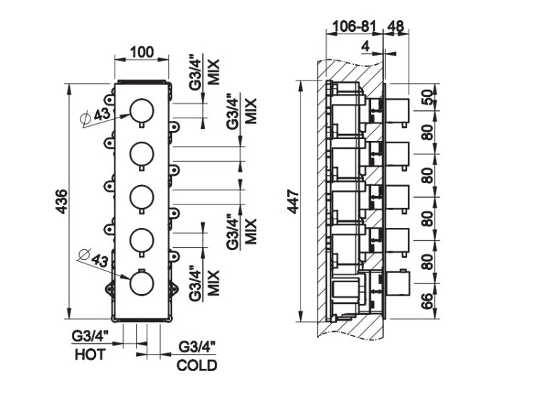 Смеситель для душа, Gessi, 316 WELLNESS, тип регулирования воды-термостатический картридж, тип установки-встраиваемый, внутренняя часть-необходимо заказать, цвет-Copper Brushed PVD, подключение на 3/4", с вертикальной/горизонтальной установкой, 4 независимых выхода Смеситель для душа, Gessi, 316 WELLNESS, цвет-Copper Brushed PVD