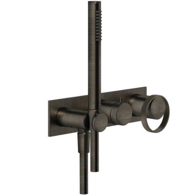Смеситель для душа, Gessi, Anello, на 2 потребителя, тип открывания воды-однорычажный, тип регулирования воды-керамический картридж, монтаж-настенный встраиваемый, отверстия для монтажа-3, в комплекте-одноструйный ручной душ, размер.мм-23, держатель лейки с подводом воды, шланг,мм-1500, переключатель, пластина-одинарная, внутренняя часть-необходимо заказать, цвет-Aged Bronze Смеситель для душа, Gessi, Anello, на 2 потребителя, цвет-Aged Bronze