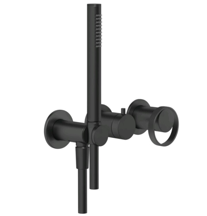 Смеситель для душа, Gessi, Anello, на 2 потребителя, тип открывания воды-однорычажный, тип регулирования воды-керамический картридж, монтаж-настенный встраиваемый, отверстия для монтажа-3, в комплекте-одноструйный ручной душ, размер.мм-23, держатель лейки с подводом воды, шланг,мм-1500, переключатель, отдельные пластины-круглые, внутренняя часть-необходимо заказать, цвет-черный матовый Смеситель для душа, Gessi, Anello, на 2 потребителя, цвет-черный матовый