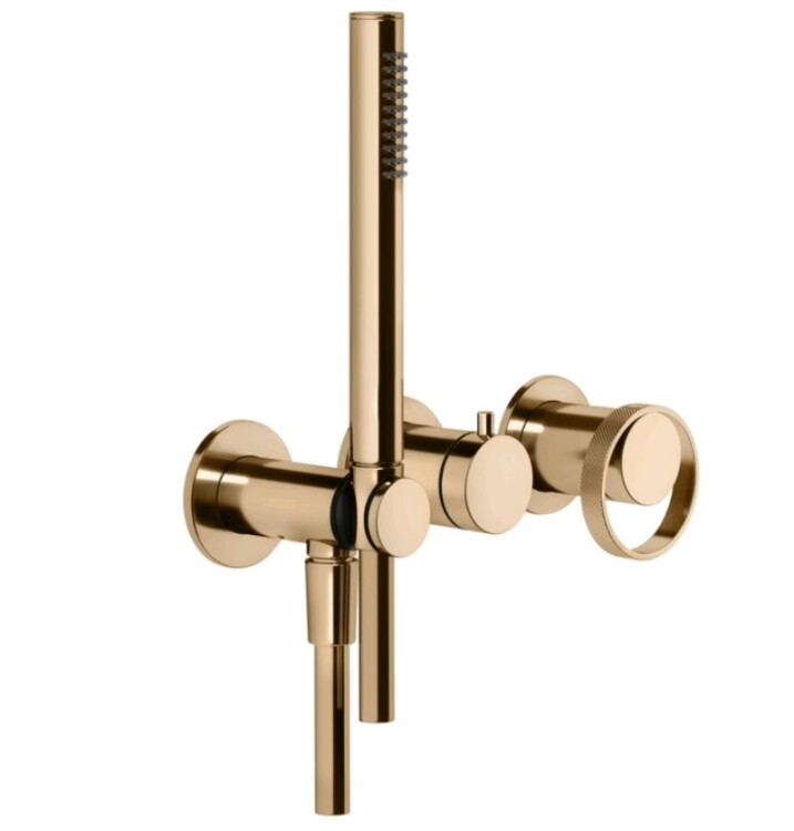 Смеситель для душа, Gessi, Anello, на 2 потребителя, тип открывания воды-однорычажный, тип регулирования воды-керамический картридж, монтаж-настенный встраиваемый, отверстия для монтажа-3, в комплекте-одноструйный ручной душ, размер.мм-23, держатель лейки с подводом воды, шланг,мм-1500, переключатель, отдельные пластины-круглые, внутренняя часть-необходимо заказать, цвет-Warm Bronze PVD Смеситель для душа, Gessi, Anello, на 2 потребителя, цвет-Warm Bronze PVD