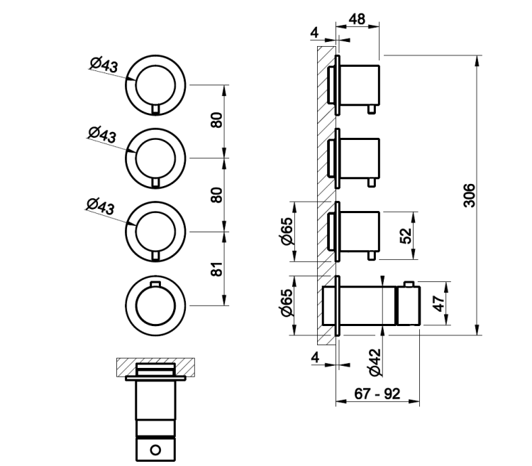 Смеситель для душа, Gessi, BATH-SHOWER 316, на 3 потребителя, тип открывания воды-вентильный, тип регулирования воды-термостатический картридж, монтаж-настенный встраиваемый, отверстия для монтажа-4, внутренняя часть-необходимо заказать, цвет-Black Metal Brushed PVD Смеситель для душа, Gessi, BATH-SHOWER 316, на 3 потребителя, цвет-Black Metal Brushed PVD