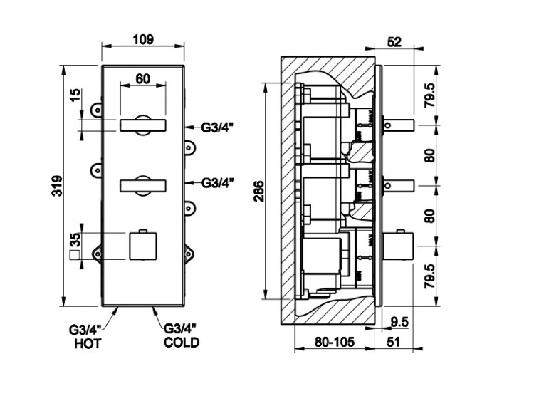 Смеситель для душа, Gessi, тип регулирования воды-термостатический картридж, тип установки-встраиваемый, внутренняя часть-необходимо заказать, цвет-Black XL, подключение на 3/4”, с вертикальной/горизонтальной установкой, с двумя независимыми выходами Смеситель для душа, Gessi, цвет-Black XL (старый арт. 43024/299)
