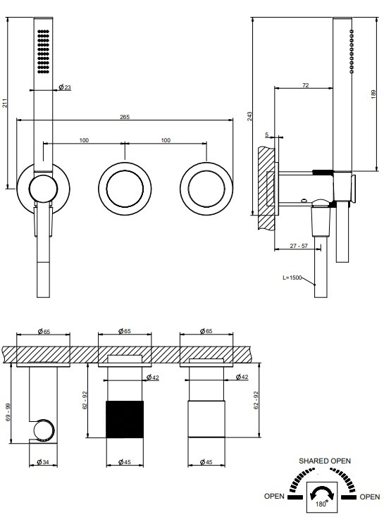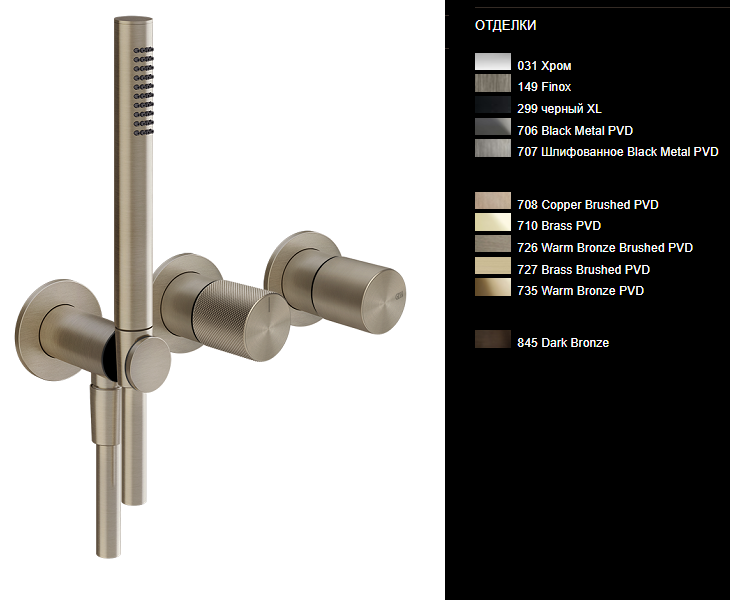 Смеситель для душа, Gessi, Habito Bath-Shower, DIAMANTATO, на 2 позиции, монтаж-настенный встраиваемый, отверстия для монтажа-3, c переключателем, подводом воды, ручным душем, держателем для душа, шлангом,мм-1500, внутренняя часть-необходимо заказать, цвет-Brushed Brass PVD Смеситель для душа, Gessi, Habito Bath-Shower, DIAMANTATO, цвет-Brushed Brass PVD