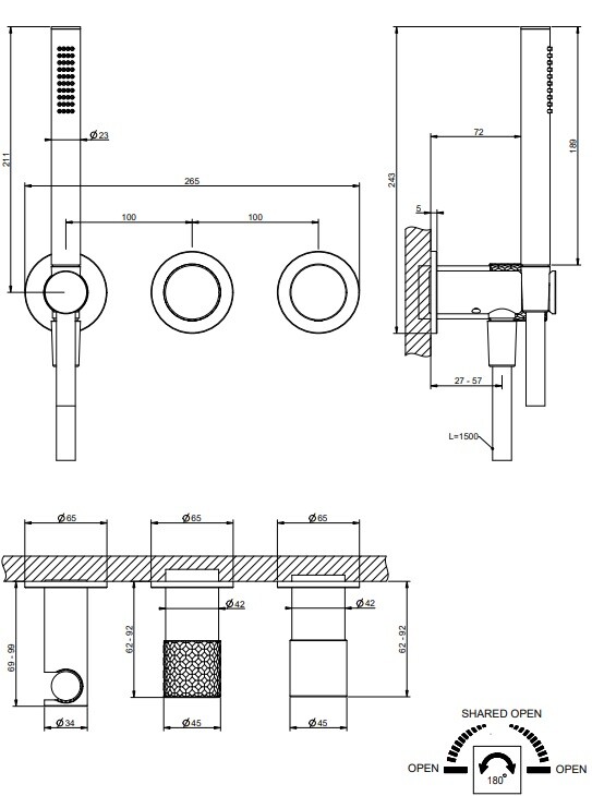 Смеситель для душа, Gessi, Habito Bath-Shower, INTRECCIO, на 2 позиции, монтаж-настенный встраиваемый, отверстия для монтажа-3, c переключателем, подводом воды, ручным душем, держателем для душа, шлангом,мм-1500, внутренняя часть-необходимо заказать, цвет-Brushed Brass PVD Смеситель для душа, Gessi, Habito Bath-Shower, INTRECCIO, цвет-Brushed Brass PVD