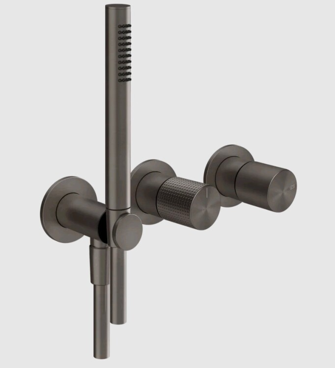 Смеситель для душа, Gessi, Habito Cesello, на 2 потребителя, тип открывания воды-однорычажный, тип регулирования воды-керамический картридж, монтаж-настенный встраиваемый, отверстия для монтажа-3, с переключателем, ручным душем, шлангом, мм-1500, держателем для душа с подводом воды, внутренняя часть-необходимо заказать, цвет-Black Metal Brushed PVD Смеситель для душа, Gessi, Habito Cesello, на 2 потребителя, цвет-Black Metal Brushed PVD