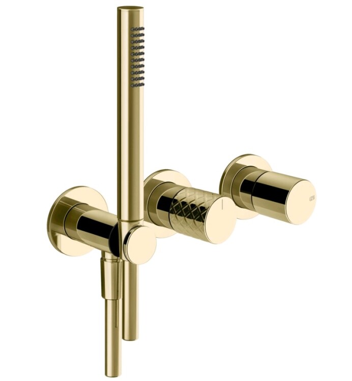 Смеситель для душа, Gessi, Habito Intreccio, на 2 потребителя, тип открывания воды-однорычажный, тип регулирования воды-керамический картридж, монтаж-настенный встраиваемый, отверстия для монтажа-3, c переключателем, ручным душем, держателем для душа c подводом воды, шлангом,мм-1500, внутренняя часть-необходимо заказать, цвет-Brass PVD Смеситель для душа, Gessi, Habito Intreccio, на 2 потребителя, цвет-Brass PVD