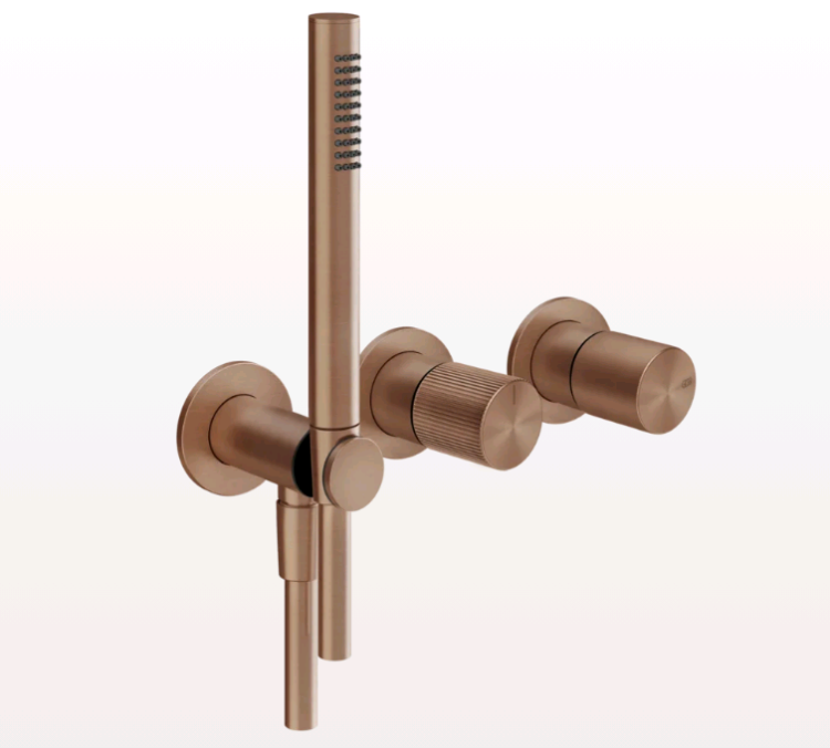 Смеситель для душа, Gessi, Habito Rigato, на 2 потребителя, тип открывания воды-однорычажный, тип регулирования воды-керамический картридж, монтаж-настенный встраиваемый, отверстия для монтажа-3, с переключателем, подводом воды, ручным душем и держателем для душа, внутренняя часть-необходимо заказать, цвет-Copper Brushed PVD Смеситель для душа, Gessi, Habito Rigato, на 2 потребителя, цвет-Copper Brushed PVD
