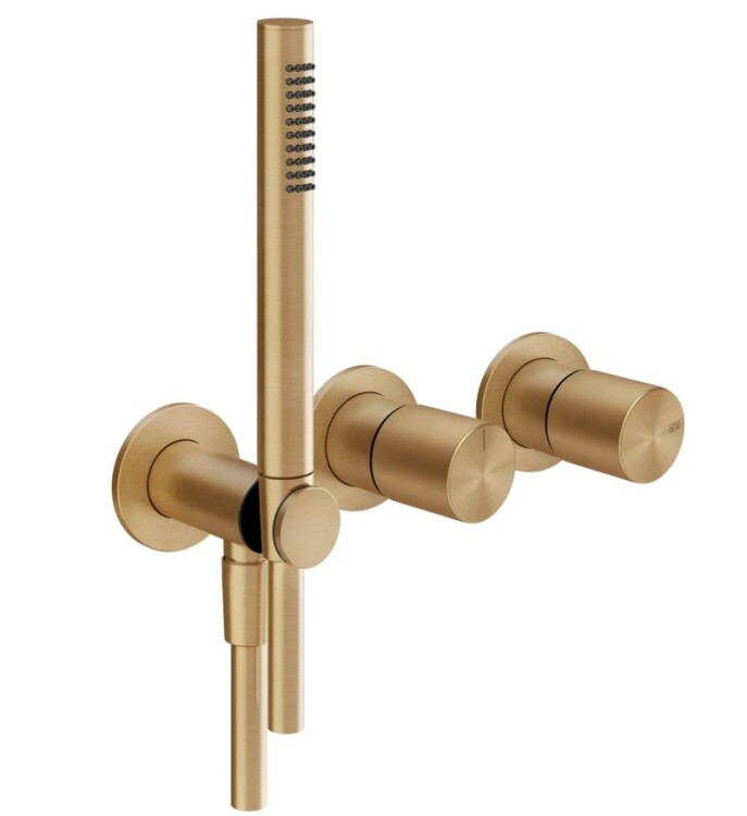 Смеситель для душа, Gessi, Habito Unito, на 2 потребителя, тип открывания воды-однорычажный, тип регулирования воды-керамический картридж, монтаж-настенный встраиваемый, отверстия для монтажа-3, с переключателем, ручным душем, держателем ручного душа с подводом воды, шлангом, мм-1500, внутренняя часть-необходимо заказать, цвет-Warm Bronze Brushed PVD Смеситель для душа, Gessi, Habito Unito, на 2 потребителя, цвет-Warm Bronze Brushed PVD