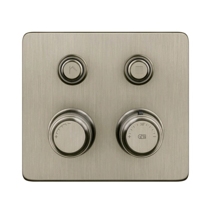 Смеситель для душа, Gessi, Hi-Fi Eclectic, на 2 потребителя, тип открывания воды-нажимной (кнопки), тип регулирования воды-термостатический картридж, монтаж-настенный встраиваемый, отверстия для монтажа-1, внутренняя часть-необходимо заказать, цвет-Finox Brushed Nickel Смеситель для душа, Gessi, Hi-Fi Eclectic, на 2 потребителя, цвет-Finox Brushed Nickel