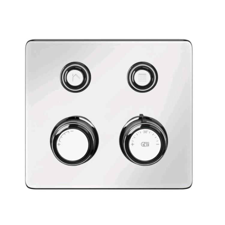 Смеситель для душа, Gessi, Hi-Fi Eclectic, на 2 потребителя, тип открывания воды-нажимной (кнопки), тип регулирования воды-термостатический картридж, монтаж-настенный встраиваемый, отверстия для монтажа-1, внутренняя часть-необходимо заказать, цвет-хром Смеситель для душа, Gessi, Hi-Fi Eclectic, на 2 потребителя, цвет-хром