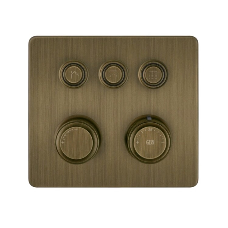 Смеситель для душа, Gessi, Hi-Fi Eclectic, на 3 потребителя, тип открывания воды-нажимной (кнопки), тип регулирования воды-термостатический картридж, монтаж-настенный встраиваемый, отверстия для монтажа-1, внутренняя часть-необходимо заказать, цвет-Antique Brass Смеситель для душа, Gessi, Hi-Fi Eclectic, на 3 потребителя, цвет-Antique Brass