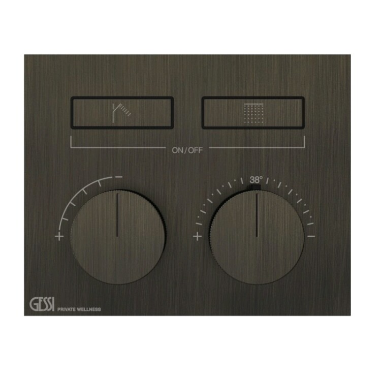 Смеситель для душа, Gessi, HI-FI, на 2 потребителя, тип открывания воды-нажимной (кнопки), тип регулирования воды-термостатический картридж, монтаж-настенный встраиваемый, отверстия для монтажа-1, внутренняя часть-необходимо заказать, цвет-Aged Bronze Смеситель для душа, Gessi, HI-FI, на 2 потребителя, цвет-Aged Bronze