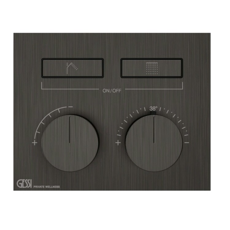 Смеситель для душа, Gessi, HI-FI, на 2 потребителя, тип открывания воды-нажимной (кнопки), тип регулирования воды-термостатический картридж, монтаж-настенный встраиваемый, отверстия для монтажа-1, внутренняя часть-необходимо заказать, цвет-Black Metal Brushed PVD Смеситель для душа, Gessi, HI-FI, на 2 потребителя, цвет-Black Metal Brushed PVD