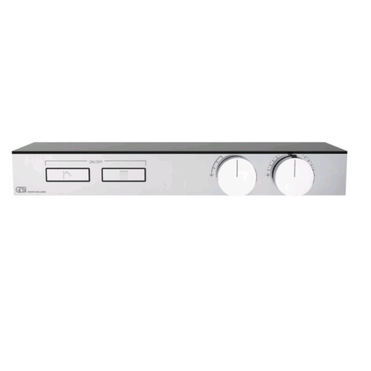 Смеситель для душа, Gessi, HI-FI, на 2 потребителя, тип открывания воды-нажимной (кнопки), тип регулирования воды-термостатический картридж, монтаж-настенный встраиваемый, отверстия для монтажа-1, с полочкой, полка выполнена из черного матового безопасного стекла, внутренняя часть-необходимо заказать, цвет-хром Смеситель для душа, Gessi, HI-FI, на 2 потребителя, цвет-хром