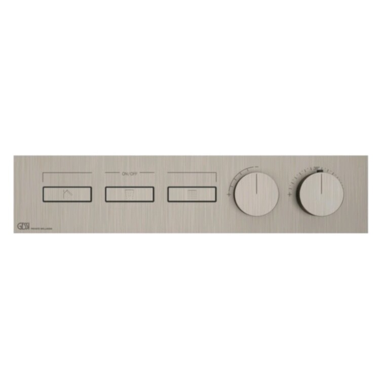 Смеситель для душа, Gessi, HI-FI, на 3 потребителя, тип открывания воды-нажимной (кнопки), тип регулирования воды-термостатический картридж, монтаж-настенный встраиваемый, отверстия для монтажа-5, внутренняя часть-необходимо заказать, цвет-Finox Brushed Nickel Смеситель для душа, Gessi, HI-FI, на 3 потребителя, цвет-Finox Brushed Nickel