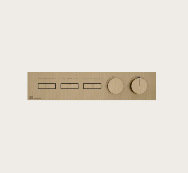 Смеситель для душа, Gessi, HI-FI, на 3 потребителя, тип открывания воды-нажимной (кнопки), тип регулирования воды-термостатический картридж, монтаж-настенный встраиваемый, отверстия для монтажа-5, внутренняя часть-необходимо заказать, цвет-Warm Bronze Brushed PVD Смеситель для душа, Gessi, HI-FI, на 3 потребителя, цвет-Warm Bronze Brushed PVD