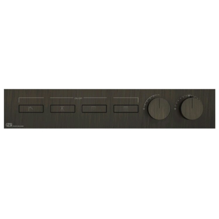 Смеситель для душа, Gessi, HI-FI, на 4 потребителя, тип открывания воды-нажимной (кнопки), тип регулирования воды-термостатический картридж, монтаж-настенный встраиваемый, отверстия для монтажа-6, внутренняя часть-необходимо заказать, цвет-Aged Bronze Смеситель для душа, Gessi, HI-FI, на 4 потребителя, цвет-Aged Bronze