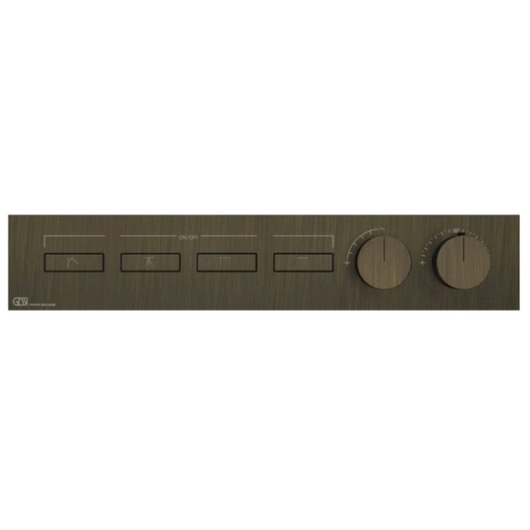 Смеситель для душа, Gessi, HI-FI, на 4 потребителя, тип открывания воды-нажимной (кнопки), тип регулирования воды-термостатический картридж, монтаж-настенный встраиваемый, отверстия для монтажа-6, внутренняя часть-необходимо заказать, цвет-Antique Brass Смеситель для душа, Gessi, HI-FI, на 4 потребителя, цвет-Antique Brass