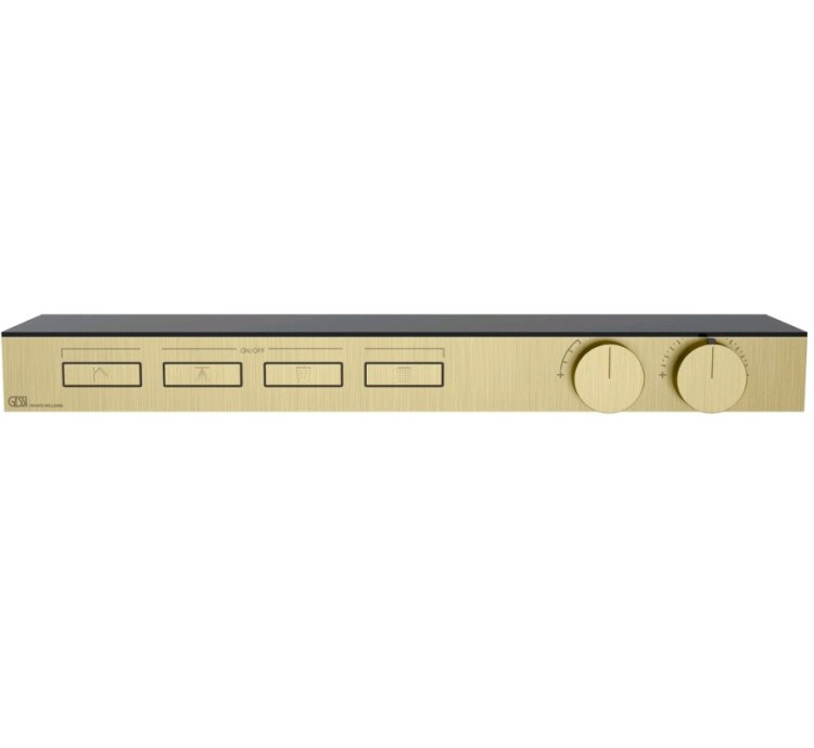 Смеситель для душа, Gessi, HI-FI, на 4 потребителя, тип открывания воды-нажимной (кнопки), тип регулирования воды-термостатический картридж, монтаж-настенный встраиваемый, отверстия для монтажа-5, с полочкой, полка из черного матового безопасного стекла, внутренняя часть-необходимо заказать, цвет-Brushed Brass PVD Смеситель для душа, Gessi, HI-FI, на 4 потребителя, цвет-Brushed Brass PVD
