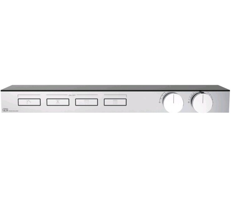 Смеситель для душа, Gessi, HI-FI, на 4 потребителя, тип открывания воды-нажимной (кнопки), тип регулирования воды-термостатический картридж, монтаж-настенный встраиваемый, отверстия для монтажа-5, с полочкой, полка из черного матового безопасного стекла, внутренняя часть-необходимо заказать, цвет-хром Смеситель для душа, Gessi, HI-FI, на 4 потребителя, цвет-хром