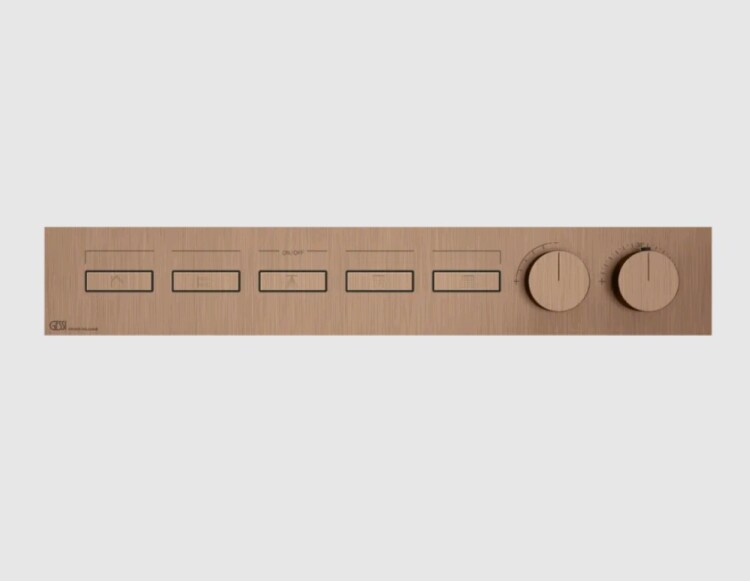 Смеситель для душа, Gessi, HI-FI, на 5 потребителей, тип открывания воды-нажимной (кнопки), тип регулирования воды-термостатический картридж, монтаж-настенный встраиваемый, внутренняя часть-необходимо заказать, цвет-Copper Brushed PVD Смеситель для душа, Gessi, HI-FI, на 5 потребителей, цвет-Copper Brushed PVD