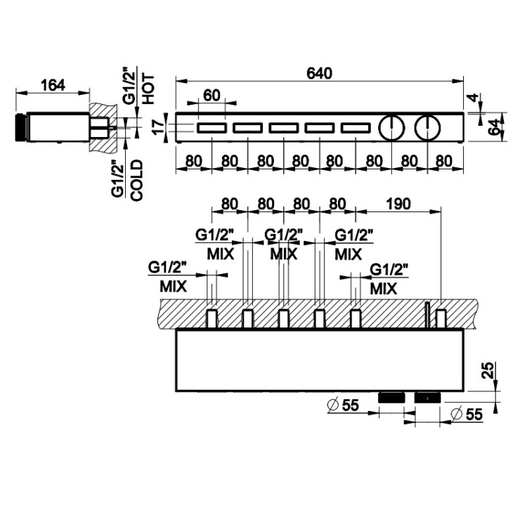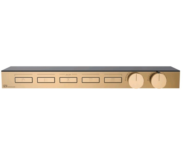 Смеситель для душа, Gessi, HI-FI, на 5 потребителей, тип открывания воды-нажимной (кнопки), тип регулирования воды-термостатический картридж, монтаж-настенный встраиваемый, отверстия для монтажа-6, с полочкой, полка выполнена из черного матового безопасного стекла, внутренняя часть-необходимо заказать, цвет-Warm Bronze PVD Смеситель для душа, Gessi, HI-FI, на 5 потребителей, цвет-Warm Bronze PVD