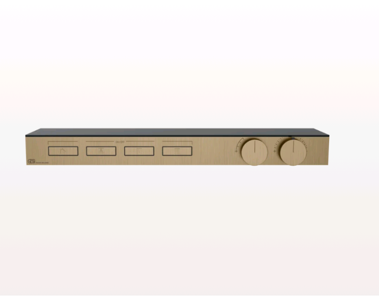 Смеситель для душа, Gessi, HI-FI Shelf, с полочкой, до 4 функций одновременно, с кнопками вкл/выкл., полка выполнена из черного матового безопасного стеклатип регулирования воды-термостатический картридж, монтаж-встраиваемый (настенный), внутренняя часть-необходимо заказать, цвет изделия-Warm Bronze Brushed PVD Смеситель для душа, Gessi, HI-FI Shelf, цвет изделия-Warm Bronze Brushed PVD